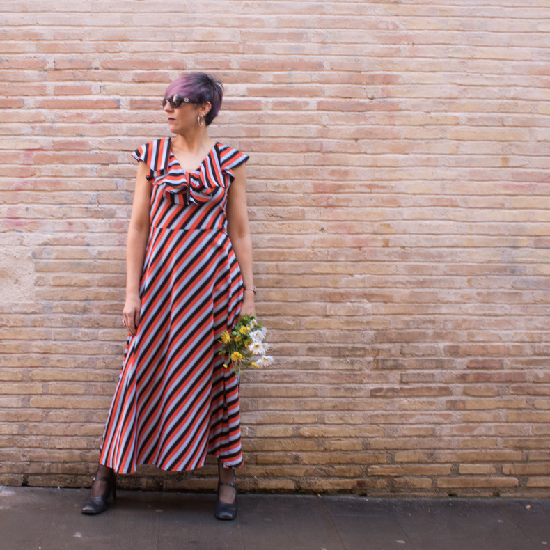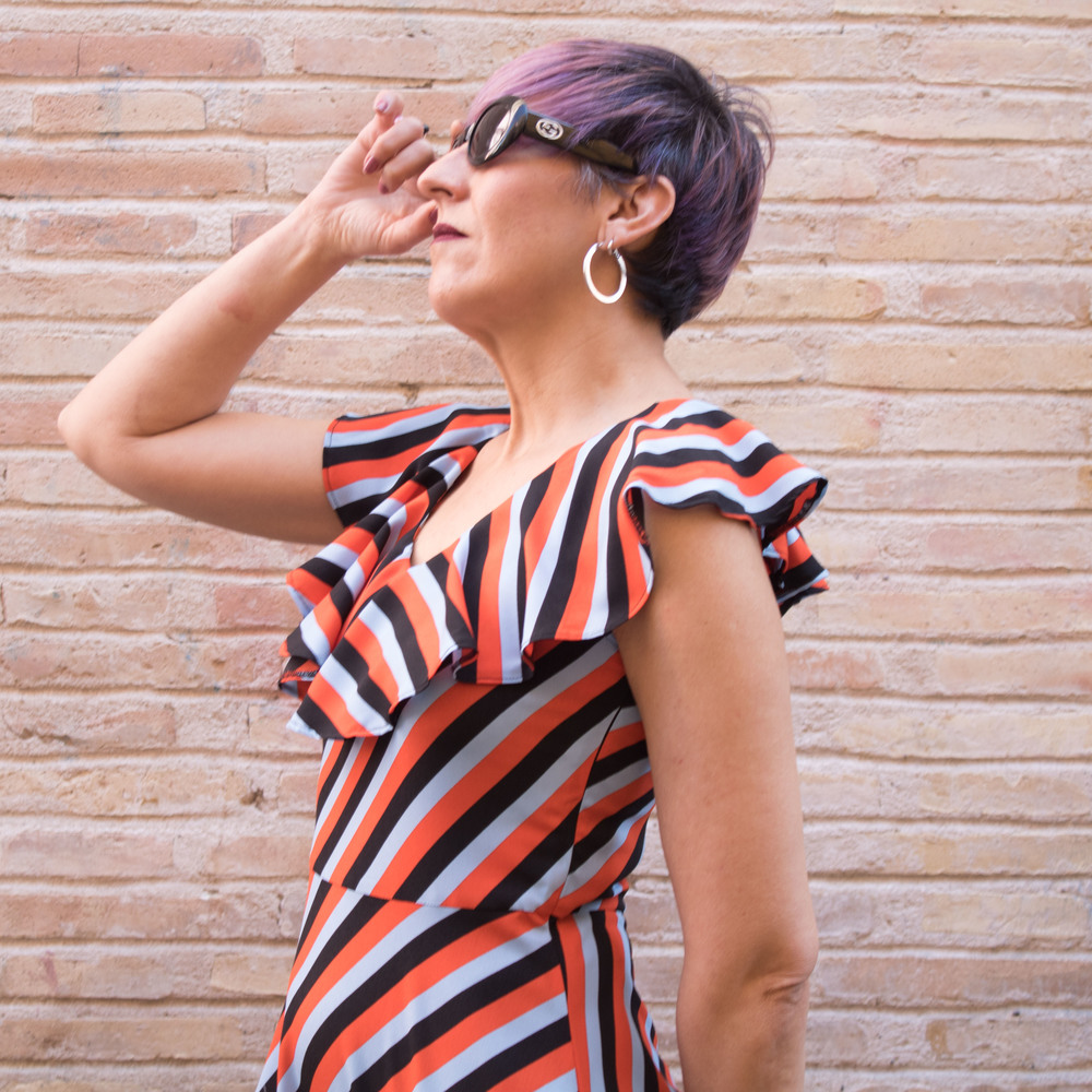 Éste diseño en concreto, con los pantalones palazzo y las rayas verticales, te ayudarán a parecer más alta y delgada; por sus colores es ideal, para un evento de día o de noche (los complementos, más discretos para la mañana, más sofisticados y arriesgados para la noche).