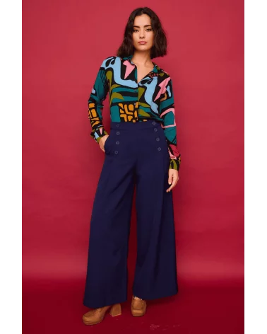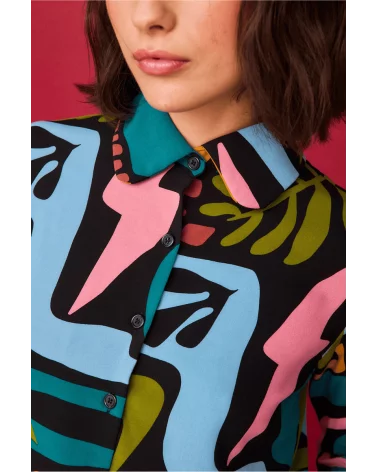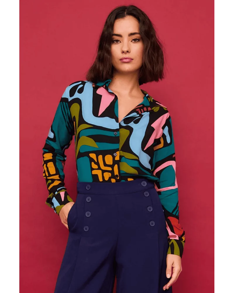 La combinación de formas abstractas convierte esta camisa en una pieza con carácter, ideal para destacar en reuniones, planes creativos o escapadas urbanas. El cuello camisero y el corte recto aportan un aire moderno y favorecedor. Curiosea nuestras novedades en faldas y pantalones.