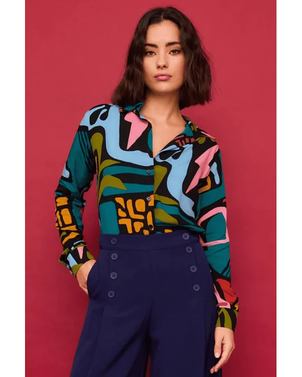 Una explosión de color para transformar tu look. La Camisa Castaña Multicolor destaca por su estampado geométrico y artístico, con tonos...