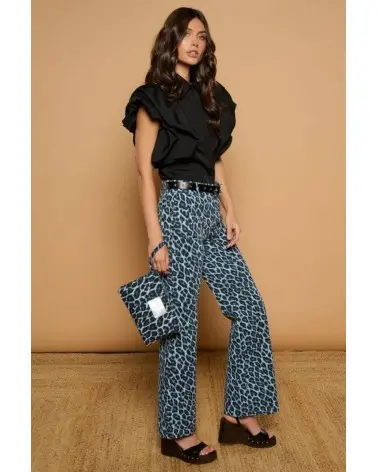 Pantalón Genetta de Minueto convierte el denim de mujer en una auténtica declaración de estilo. Su estampado animal print en tonos azules rompe con lo convencional, mientras la silueta ligeramente acampanada estiliza la figura y alarga visualmente la pierna. Con carácter setentero y espíritu actual, es una de esas piezas clave de la temporada primavera verano que elevan cualquier look. Un diseño protagonista dentro de SS2026 para mujeres que no quieren pasar desapercibidas.