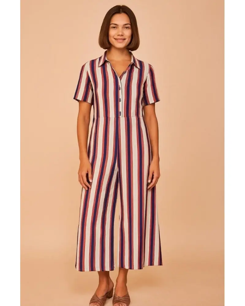 El Mono Biarritz Rayas de Smile está pensado para quienes buscan una prenda vistosa, cómoda y con ese encanto que hace fácil vestir bien. Su diseño de línea amplia, con manga corta, cuello camisero y cierre frontal abotonado, transmite una estética relajada pero muy cuidada. Es uno de esos monos que funcionan por sí solos y que, con muy poco, consiguen un look redondo.