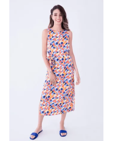 Vestido midi con original estampado de colores vibrantes inspirado en las mañanas de sol y tardes de terraza. Tirante ancho y escote barca. De corte recto con abertura lateral y cinturón en el mismo tejido. Forrado. El Vestido Midi Hueso de Lylu Wear te ofrece un estilo versátil que se adapta a todas las situaciones. Perfecto para tardes de terraza con amigos en la ciudad o para pasear por la playa, este vestido es tu compañero perfecto. Desliza hasta la descripción para ver la tabla de medidas del producto.