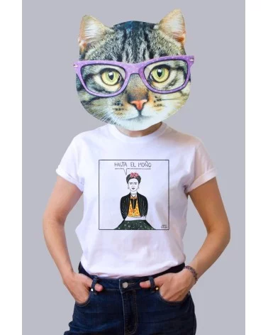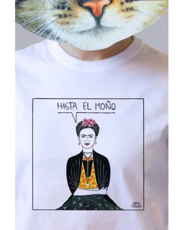 Camiseta unisex de manga corta blanca. Camiseta con ilustración en el delantero de Frida Kahlo y la frase "Estoy hasta el moño", una expresión muy común y con la que nos resultaría fácil imaginar a Frida gritándola a los cuatro vientos dada su fuerte personalidad y sus complejas emociones. De la marca Lord Turner, ilustradores de Zaragoza que nos hacen sonreir con una frase insperada.