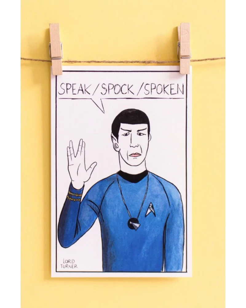 Postal de alta calidad con impresión digital del protagonista de la serie de aventuras, Star Trek. Spock y su característico saludo vulcano, nos mantuvieron frente a la pantalla semana tras semana. De la marca Lord Turner, ilustradores de Zaragoza que nos hacen sonreir con una frase insperada.