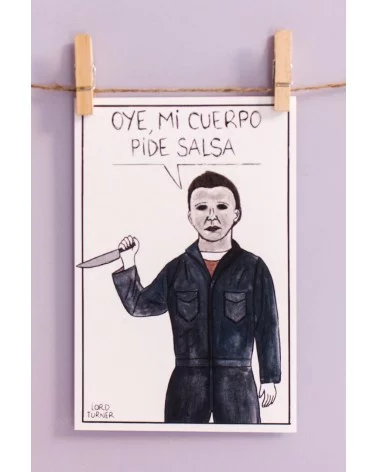 Postal de alta calidad con impresión digital de Michael Myers con la terrorífica frase "Oye, mi cuerpo pide salsa". Michael Myers es un personaje de la serie de películas Halloween del género slasher ¿No sientes escalofríos?. De la marca Lord Turner, ilustradores de Zaragoza que nos hacen sonreir con una frase insperada.